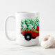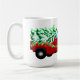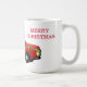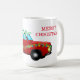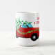 A caneca de café cerâmica de Natal é mostrada com um impressão de caminhão vermelho de férias festivo com texto Feliz de Natal. Personalize este item ou comprar como está. Imagem de estoque