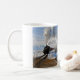 Uma caneca com uma imagem de um trem no inverno. Ou é verão?