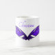 Pena com barbas roxas formando a pena. Duas penas se cruzam na base do cálamo (haste). As pontas das penas sobem para cima à direita e à esquerda do centro. Entre as penas está o nome que você edita.