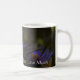 A flor roxa bonito com um coração sentiu o país dizer (vive bem, o riso frequentemente, ama muito.) em uma caneca de café branco.
