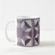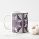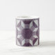 Bloco acolchoado no teste padrão roxo e branco do "carretel". Oito carretéis giram em torno de um centro do roxo escuro. Um impressão roxo da flor é a "linha " s (e a beira quadrada). A cor branca os diamantes e os triângulos, e o roxo com linhas colorem o octagon central e os trapezoids exteriores. O quadrado da edredão é repetido 3 vezes em torno da caneca.