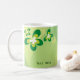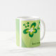 Esta caneca bonito é perfeita para todo o amante da borboleta. Tem um fundo verde com lotes de borboletas verdes por todo o lado nela. Cada lado tem um espaço feito sob encomenda para um nome ou uma mensagem.