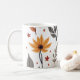 De Café É uma caneca decorada com flores e folhas.