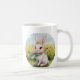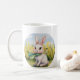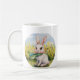 Esta é uma caneca com um coelho fofo sentado sobre ela. Tenha um dia feliz