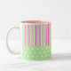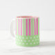 Caneca customizável que caracteriza padrões bonitos de listras e de bolinhas cor-de-rosa e verdes.