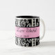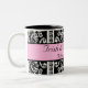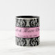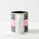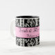 Caneca preto e branco bonita do damasco com uma listra cor-de-rosa no meio para o texto. Personalize com seus nomes e data do casamento para um grande obrigado pequeno você presente ou para usar-se para o senhor mesmo. Excelente para pequenos almoços wedding.