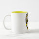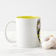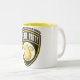 Caneca branca e amarela com logotipo do partido do xixi do amarelo e do preto