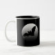 Esta lua com uma silhueta do bastão é mostrada brilhantemente no fundo preto da caneca. Excelente para o café do amanhecer ou do dia do médio. Mostre seu espírito do Dia das Bruxas!