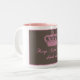 Agrida com imagem do fundo marrom e a coroa cor-de-rosa e as palavras que lêem "mantêm a calma e bebem o chá". A caneca pode ser personalizada ao estilo de sua escolha.