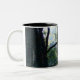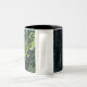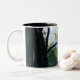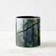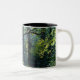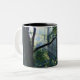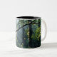 Brilhantes raios brancos do sol matinal, que passam por trás de galhos escuros para uma rica floresta verde de verão, com árvores maciças cobertas de mariposa e mato fértil.