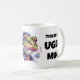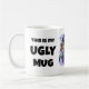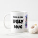 Esta design com palavras, "Esta é a minha caneca feia", apresenta uma face sapo que pode ser substituída pela sua própria imagem. Seja criativo, dê a alguém que aprecie a beleza em todos.