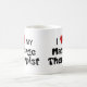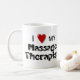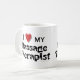 Esta caneca diz, "mim ama meu terapeuta da massagem" em uma pia batismal do divertimento, com as mãos que fazem parte das letras, e um coração em vez do amor da palavra.