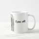 Agrida com um fim acima da foto da cabeça de um emu, com as palavras "olhos fora!" e "esta é MINHA caneca".