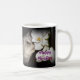 Um gato britânico de Shorthair do gato malhado de prata bonito com eyecolour alaranjado nesta caneca original do gato com "texto do feliz aniversario" nas flores brancas e no fundo preto da foto. Um presente perfeito para amantes do gato. Personlize por favor com seu próprio texto. Foto original do gato pelo mmersdesign.