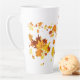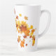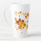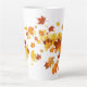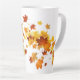 A caneca de café cerâmico em café é mostrada com folhas de impressão de outono bonito.