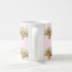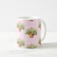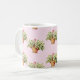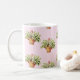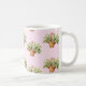 A caneca chique da casa de campo caracteriza cestas de vime do lírio das flores do vale em um fundo cor-de-rosa e branco das bolinhas.