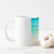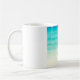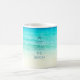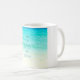 Esta caneca da praia caracteriza uma fotografia de acalmar águas azuis do oceano com as ondas delicadas que rolam na areia.