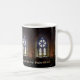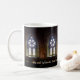 Um copo da serenidade na manhã: nossa caneca nova caracteriza a janela bonita da igreja antiga na ilha de Iona no Hebrides interno de Scotland, e o 37:37 do salmo: Seja ainda antes do senhor e da espera nele.
