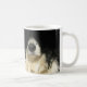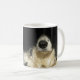 O nariz do cão preto e branco fecha a caneca