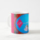 Uma caneca bonita do café ou do chá com um casal da dança no vestido formal e no kilt contra uma xadrez do azul da pervinca e do vermelho de cereja com bluebells escoceses.