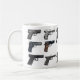 Seja como o Col. Casey do MANDRIL e tenha sua manhã disparada de java de uma caneca da arma. Quinze pistolas diferentes decoram este copo de café.