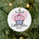 Nossa IRMÃ MAIS NOVA que MAIS DOCE o design é uma maneira bonito de comemorar a irmã mais nova está em sua família. Caracterizando um cupcake de sorriso doce com glacé cor-de-rosa e uma cereja vermelha grande na parte superior com um fundo cor-de-rosa do coração. Aperfeiçoe para um aniversário ou sua árvore de Natal. Texto customizável. Também disponível em t-shirt e em presentes. Original de PinkInkArt!