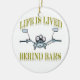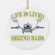 Aqui nós temos uma vida da motocicleta somos vividos atrás dos bares projetamos com texto sombreado bonito do ouro amarelo e o gráfico perfeito de guiador da motocicleta no centro. Aprecie! Você pode adicionar uma imagem ou todo o texto que você gostar a estes enfeites de natal batendo o botão da personalização. Você pode igualmente adicionar o ano se você gosta e muda mesmo da cor do fundo de personalizar mais seu ornamento. Aprecie!