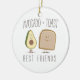 Um ornamento que caracteriza uma ilustração dos desenhos animados de um abacate e de uma parte de brinde com caras. O texto diz o "abacate + Melhores amigos do brinde."