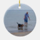 Meu marido e nosso cão embebem acima o sol que senta-se no surf do Lago Michigan na praia de Hammond em 2010.
