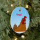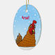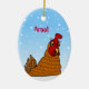 Este modelo cerâmico feito sob encomenda dos enfeites de natal tem uma galinha bonito dos desenhos animados olhá-lo curiosa. Acima da galinha, diz, "Aroo!" Os amantes da galinha sabem este som. A parte traseira diz, "que os meios "boas festas" em Chook." O fundo é céu azul e neve de queda.