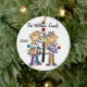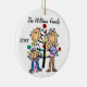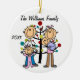 Um ornamento cerâmico redondo bonito do feriado do Natal da lembrança caracteriza uma figura família da vara que inclui um pai, uma mamã, uma menina da criança, e e um bebé na frente de uma árvore de Natal decorada com áreas que você pode personalizar com seu nome de família e o ano em curso! Este ornamento bonito da lembrança do feriado faz um grande presente para que a família nova comemore um ano especial!