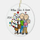 Um ornamento cerâmico redondo bonito do feriado do Natal da lembrança caracteriza uma figura casal da vara com um bebé em uma cobertura cor-de-rosa e em um cão que estão na frente da árvore de Natal decorada com áreas que você pode facilmente personalizar com seus nomes e data ao ano em curso! Este ornamento bonito da lembrança do feriado faz um grande presente para qualquer um que teve um bebé novo no ano em curso!