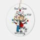 Um ornamento cerâmico redondo bonito do feriado do Natal da lembrança caracteriza uma figura casal expectante e seu gato da vara do animal de estimação na frente de uma árvore de Natal decorada com áreas que você pode personalizar com nomes e o ano em curso! Este ornamento bonito da lembrança do feriado faz um grande presente para que a mamã e o pai deva comemorar um ano especial!