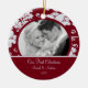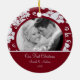 Nossos primeiros enfeites de natal da foto caracterizam um fundo vermelho & cinzento bonito do damasco! Personalize com sua informação e data e você são todos ajustam-se para ir! Presente datado maravilhoso da lembrança para seu primeiro Natal e uma grande adição a você coleção dos enfeites de natal.