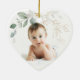 Ornamento de fotos do batismo bebê - Esta design apresenta uma ilustração da folhagem verde e ouro no estilo de aquarela. No verso - você pode colocar sua foto