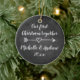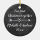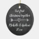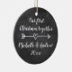 Nosso ø ornamento junto personalizado da árvore do Natal. As decorações feitas sob encomenda com seta e escova do coração script a tipografia handlettering. Fundo preto do quadro com modelo branco elegante da escrita da caligrafia. Primeira ideia bonito do presente da festa de Natal para o casal, newlyweds, noivos, namorado e namorada, marido e esposa contratados. Decoração na moda personalizable com nome ou cartões de natal. Faça seus próprios acessórios x-mas para ele e ela. Feliz Natal! Quadro-negro com texto indicado por letras da mão. Corda Dourado do brilho incluída. Pia batismal escrita à mão à moda com marca do amor.