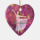 Clara triguenha no pointe do en do arabesque na parte dianteira deste ornamento do coração. O verso tem o texto comemorativo, que pode ser personalizado editando este produto. Ilustração por Mitzi Sato-Wiuff para o estúdio Miyabi.