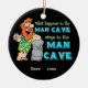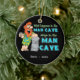 Um homem das cavernas de cabelo vermelho que inclina-se em uma pilha das pedras e que guardara um copo em sua mão é a peça central deste ornamento lunático da lembrança. O texto lê: "O que acontece nas estadas da caverna do homem na caverna do homem." Há um texto customizável para adicionar seu nome e a informações adicionais ou, se você prefere, suprime deste texto.