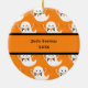 Este ornamento bonito é perfeito recordar o primeiro Dia das Bruxas do bebê. Caracteriza um caráter adorável do fantasma que guardara um sinal da "vaia". A paleta de cores alaranjada e preta é perfeita comemorar este feriado. A mensagem lê "meu primeiro Dia das Bruxas" mas pode ser personalizada a toda a mensagem de sua preferência. Adicione uma imagem do bebê para terminar isto mantêm a causa. A parte traseira do ornamento inclui um teste padrão do fantasma, o nome do bebê e o ano. Isto faz um grande presente que os pais e as avós amem para os próximos anos.