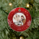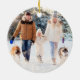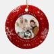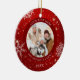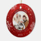 Crie um enfeite festivo e moderno de fotos em branco, em vermelho, com flocos de neve brancos e personalizado com título, foto e nomes personalizados e ano na frente e uma foto de sangramento de cheio no verso. Entre em contato com o designer por meio do Zazzle Chat ou makeitaboutyoustore@gmail.com se você quiser que este design seja modificado ou outro produto.