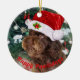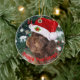 Este adorável ornamento cerâmico apresenta uma imagem de um adorável cão de labradroodle de chocolate vestindo o chapéu de Papai noel, sentado perto de uma árvore de Natal decorada, e a expressão "Felizes Felizes Felizes Felizes Feriados".