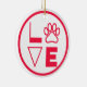 AMOR soletrado com uma pata em legal tipo moderno. Vermelho brilhante sobre um fundo branco. O verso é vermelho com três linhas de texto branco que você pode personalizar. O texto de exemplo é Feliz Natal, Nossa casa está cheia de amor. Mas você pode mudar a mensagem, adicionar o nome do seu cachorro ou remover o texto completamente. Um presente de excelente para novos pais de estimação!