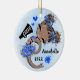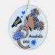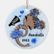 Enfeite de árvore de Natal bonitinho, Na moda e giro. Cores azuis da equipe. Apresentando uma cheerleader de pele escura com design de cabelo preto/castanho e um fundo azul de cor d'água. Mais cores de equipe, assim como cabelo e cores de pele disponíveis no meu compro. Personalize com seu nome e ano. Dons de excelente e guardar para Cheerleaderes, Equipes de Animação e Treinadores.
