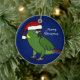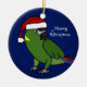 Feliz Natal! Ornamento colocado um colar amarelo do Macaw dos desenhos animados do papagaio que veste um boné do papai noel, contra um fundo azul escuro. Decorações fabulosas do amante do pássaro esta época natalícia.