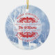 Características deste design moderno uma cena do inverno com árvores e cervos em uma paleta de cores azul macia. Um círculo inclui no centro um nome de família e tem uma decoração ornamentado com as palavras "Feliz Natal". Este design é perfeito decorar durante os feriados.
