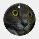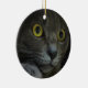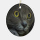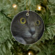 Um tiro do fim-acima da cara de um gato cinzento com olhos amarelos e os alunos dilatados, descansando sua cabeça em sua pata e olhando fixamente atenta em algo atrás da câmera.