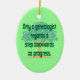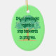 Este ornamento engraçado da árvore genealógica caracteriza o subtítulo "somente considerações dos genealogists uma etapa para trás como o progresso" em um fundo verde com uma grande árvore. Este ornamento tem a impressão lateral dobro, mas está igualmente disponível com única impressão lateral e em outras formas. Está igualmente disponível em t-shirt de harmonização, em botões, em ímãs, em sacolas e em mais presentes da árvore genealógica do divertimento. Este ornamento olharia o excelente que pendura de sua árvore de Natal, de seu espelho retrovisor, ou como uma tração do fã de teto. Faz um grande stuffer do presente ou da meia para um genealogist que procurara por antepassados em sua árvore genealógica.