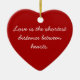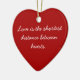 Este ornamento cardíaco vermelho vem com uma citação que diz, "O amor é a menor distância entre as ouvidos." O sentimento pode ser alterado para um de seus próprios ou excluído, se desejar.