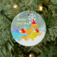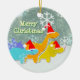 Ornamento dos dinossauros do Feliz Natal. Três dinossauros de sorriso felizes: Diplodocus alaranjado, Stegosaurus azul e Triceratops amarelo com chapéus do papai noel em uma paisagem do inverno da neve com os flocos da neve que caem com o ornamento customizável do "Feliz Natal" do texto. Na parte traseira igualmente nossos 3 amigos do dinossauro e texto customizável " Feliz Natal". Estes enfeites de natal bonitos são inteiramente customizáveis, adicionam seu texto pessoal, personalizam-no com seus imagens e textos! Um ornamento doce adorável na árvore de Natal, pendurando em sua parede ou na janela!