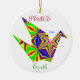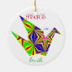 O guindaste de papel dobrado transformou-se um símbolo da paz de mundo. A história, Sadako e mil guindastes de papel, é sobre uma menina japonesa nova, Sadako Sasaki, que se tornou doente com leucemia após o bombardeio de Hiroshima. Quando o mal, Sadako começou a dobrar os guindastes de papel de acordo com a tradição japonesa que dobrar mil guindastes pode trazer a boa saúde, a prosperidade e a longa vida. Sadako morreu na idade de doze, antes que poderia alcançar seu objetivo. Quando tinha dobrado 644 guindastes, seus colegas terminaram os 356 permanecendo. Devido a Sadako e a sua história, suportes de um parque da paz em Hiroshima hoje. No parque, há uma estátua de Sadako que guardara um guindaste do origami em suas mãos. Cada ano, milhares dos guindastes de papel é dobrado e enviado a Hiroshima, Japão como um símbolo da esperança para a paz na terra. Este ornamento pode ser pendurado na árvore de Natal, ou seja dado como uma lembrança para cumprimentos no ano novo. O texto é customizável em ambos os lados, assim que você pode personalizar o ornamento para toda a pessoa e ocasião especiais. O guindaste é projetado com um teste padrão kaleidoscopic de cores brilhantes. Eu posso pôr este design sobre outros produtos. Apenas pedidos do email a acore327@gmail.